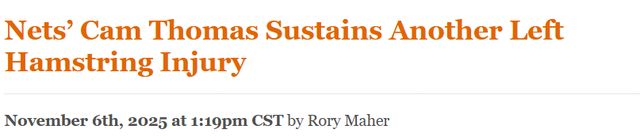 北京时间11月7日,据《纽约邮报》的布莱恩-刘易斯报道,在昨日对阵步行者队的比赛第一节,篮网后卫卡姆-托马斯左腿筋再次受伤,上赛季正是这一部位的伤病让他仅出战25场比赛。